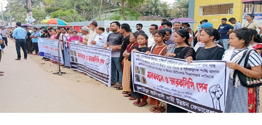 মানববন্ধনে কয়েক শতাধিক আদিবাসী নারী-পুরুষ, রাজনৈতিক দলের নেতা ও বিভিন্ন সংগঠনের প্রতিনিধিরা অংশ নেন।